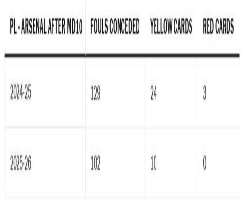 而本赛季同一时间点,尽管早期赛程艰难,阿尔特塔的球队却无人被罚下场,且仅收到10张黄牌。他们不仅领跑英超积分榜——在公平竞赛榜上也名列前茅。