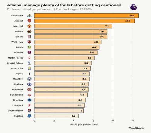 场上的犯规——尤其是那些导致黄牌或红牌的犯规——常常是在绝望情况下做出的。能够控制球权,犯规的可能性就会降低。阿森纳本赛季英超场均控球率为58.42%——仅切尔西(59.12%)和利物浦(61.71%)高于他们。