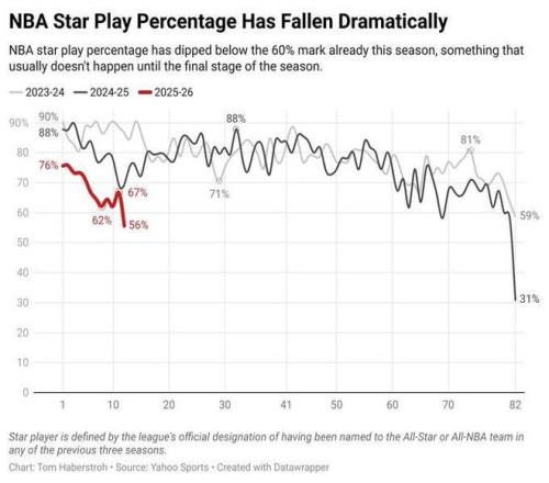 本赛季至今,NBA球星的出勤率仅有56%,对比上赛季,这一出勤率直到赛季末段才出现,而在上上赛季的23-24赛季,整个赛季最低出勤率才59%。截至目前,NBA球星缺席场次已高达200场,这已经是23-24赛季同期数量的两倍。