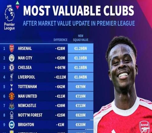德转英超俱乐部身价排名:阿森纳12.9亿第1、曼城切尔西二三位 -